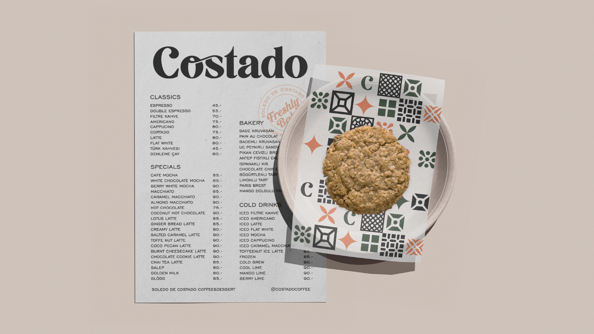 Shortly after branding Soledo pizzeria, we helped the owners to create their sister brand with two coffee houses to be opened in two Aegean cities – İzmir and Denizli. Inspired by their first brand Soledo next door, we chose the name Costado which means side stand in Spanish. We designed the brand concept, logo and other branding elements of the café and helped the owners with interior and lighting design to reflect the look & feel of this cute & cosy brand. To make this Spanish-inspired cafe to be an ultra-Instagram-able spot, we created a unique pattern for the breeze blocks to decorate the cute back patio, perfect for lounging. We guided them with social media and Costado quickly became popular as the new neighbourhood go-to in Bostanlı, İzmir with delicious pastries, enticing desserts and strong brews made of high-quality coffee beans.