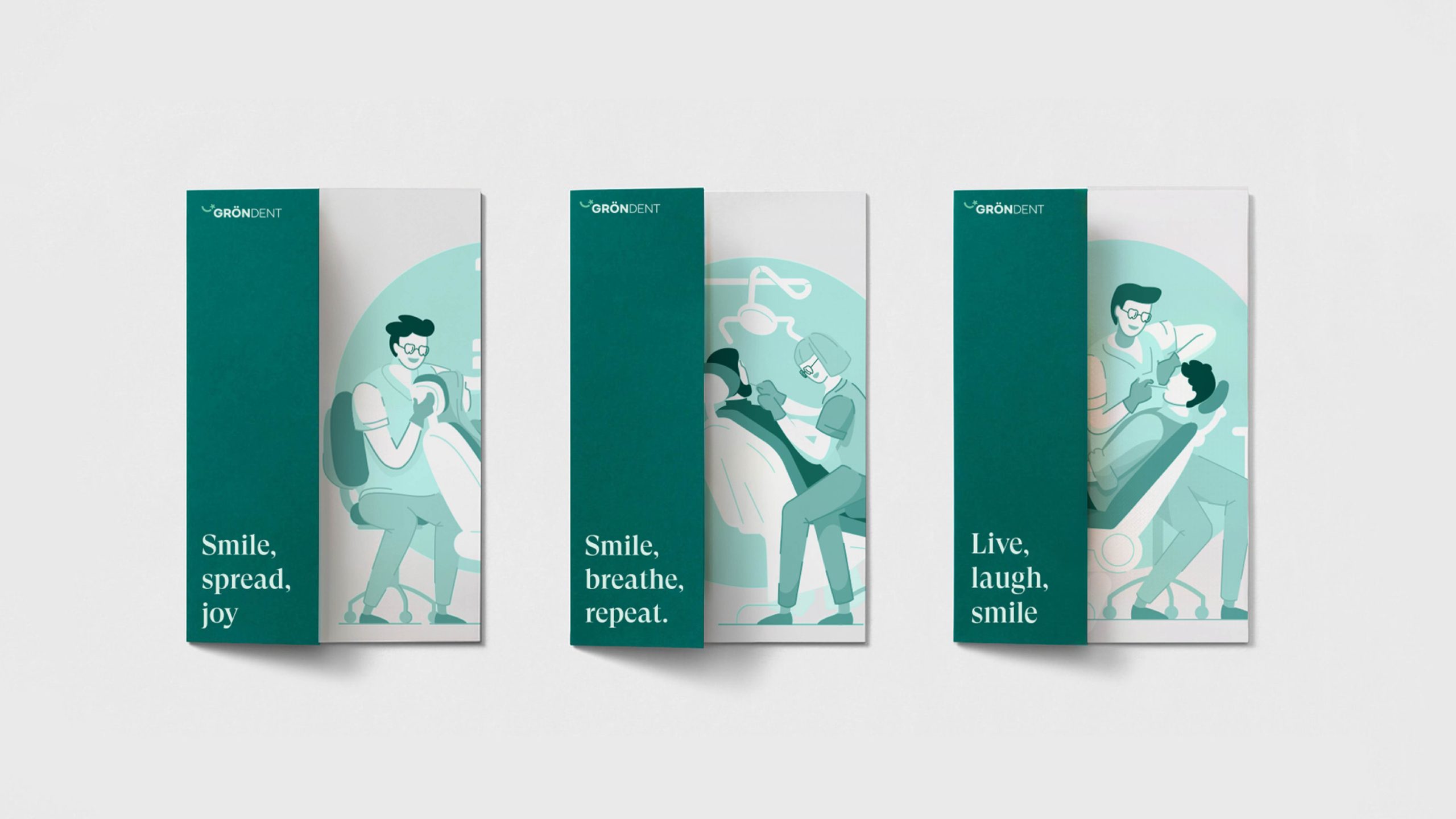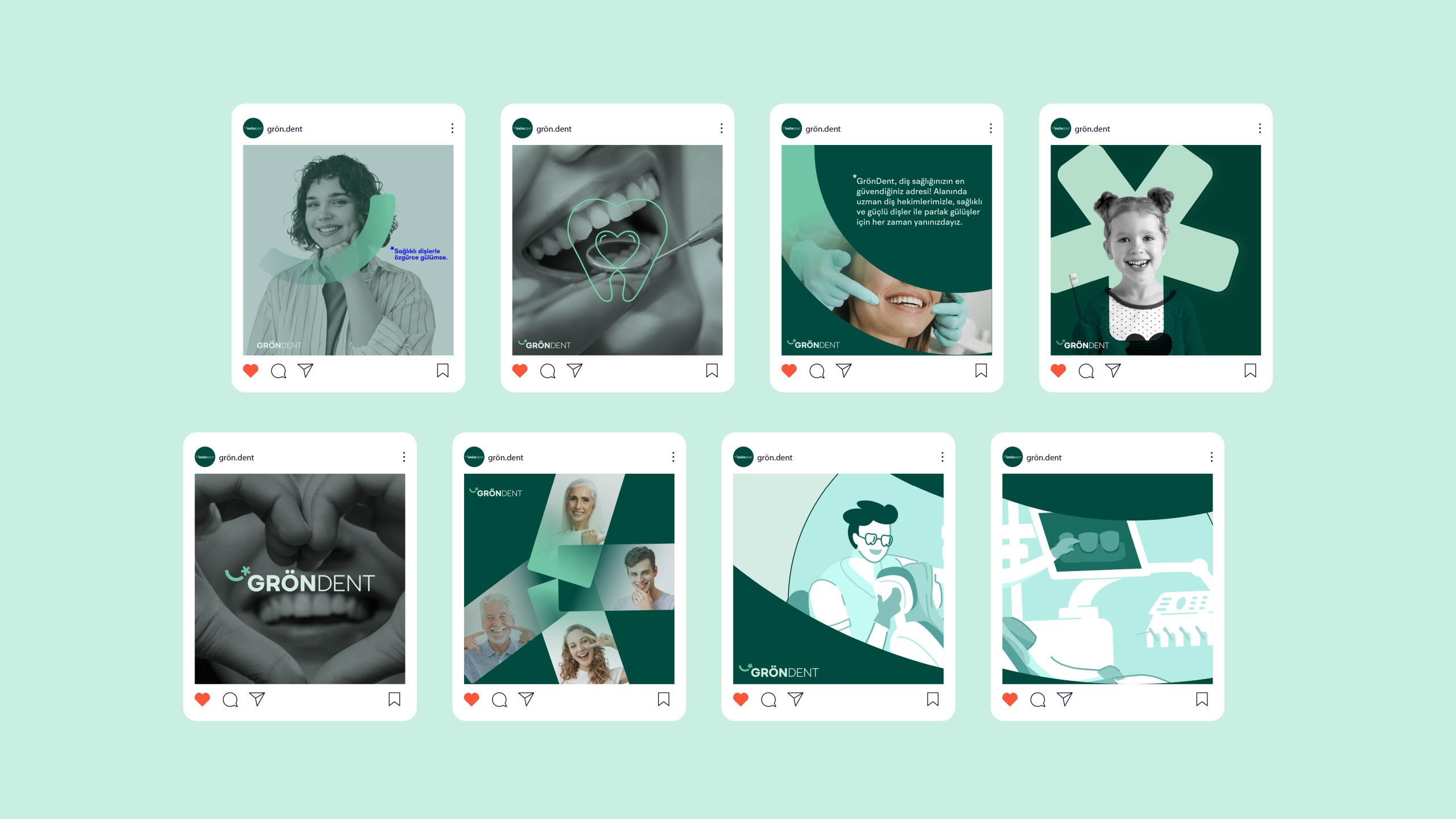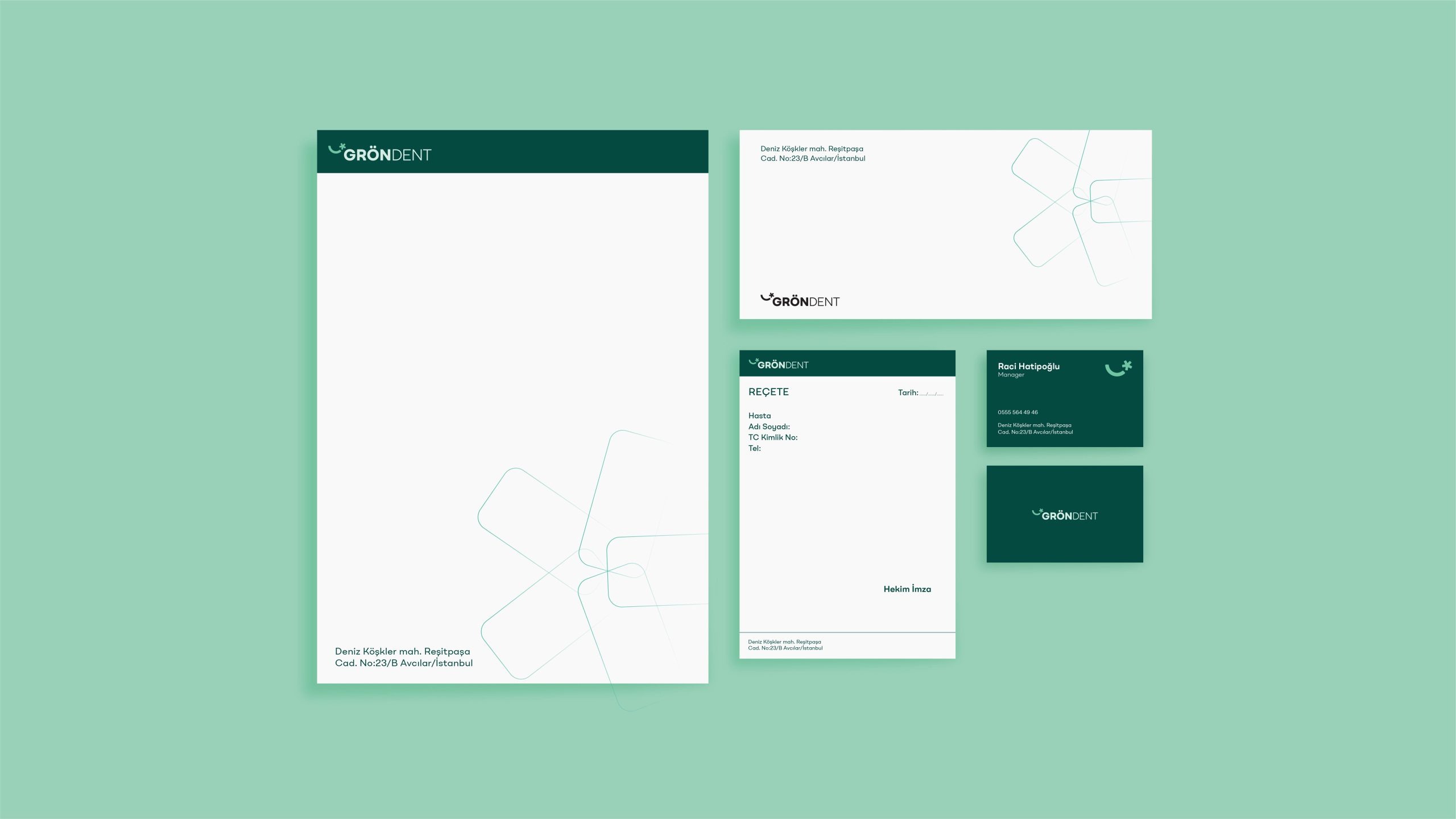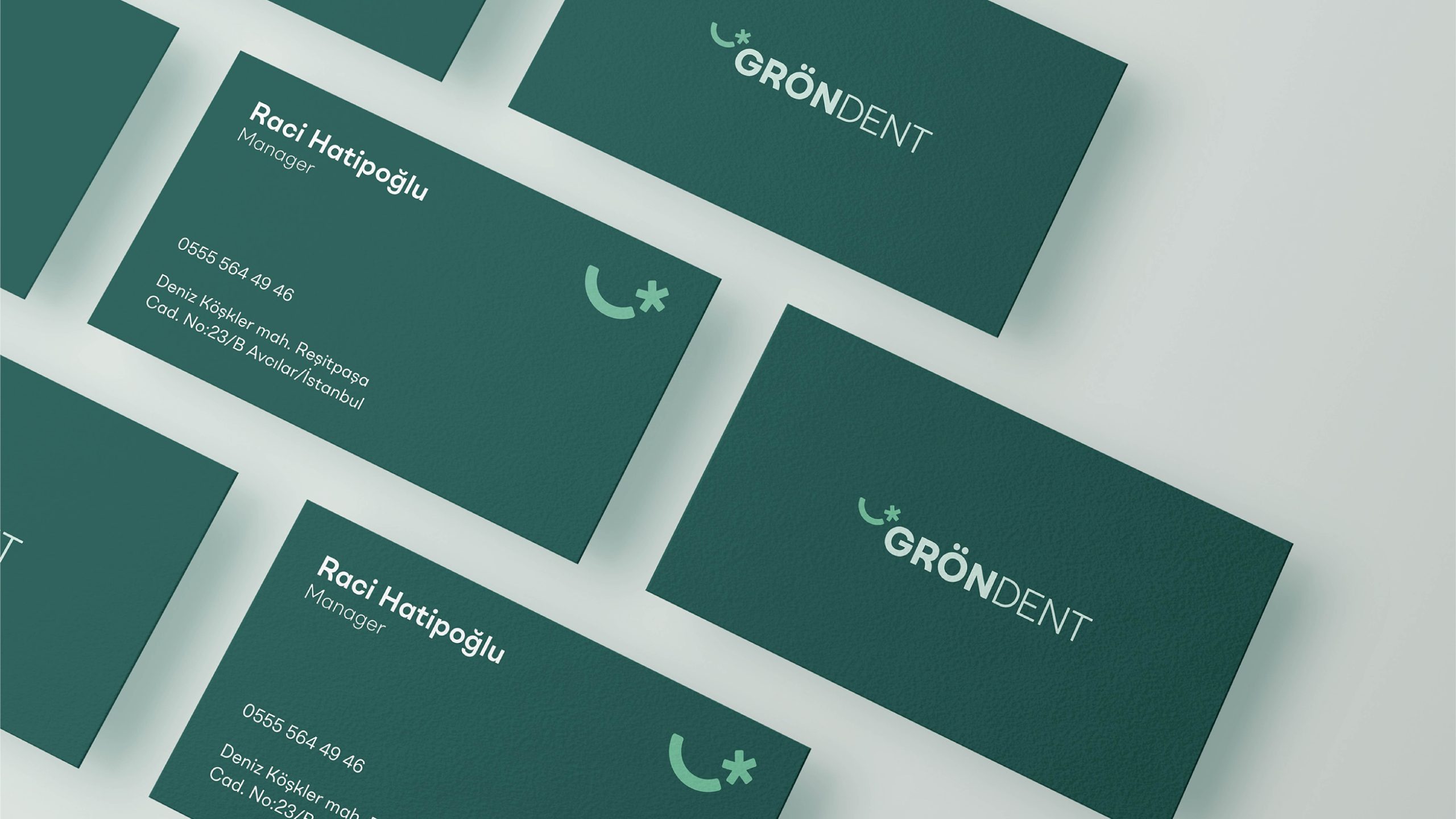 GRÖNDENT is dedicated to providing exceptional dental health services, focusing on enhancing and maintaining oral health through the latest technologies and modern treatment methods. Committed to exceeding the expectations of both local and international patients, the clinic aspires to become a trusted name in dental care. Its visual identity reflects professionalism and trust, with an abstract crescent symbolizing a healthy smile, a minimalist sans-serif font for a clean and professional image, and a dark green palette complemented by light green tones to evoke health, nature, and tranquility. A subtle star detail adds warmth and highlights the brand’s innovative and patient-centered approach, embodying the message, “A smile you can wear with ease and comfort.”